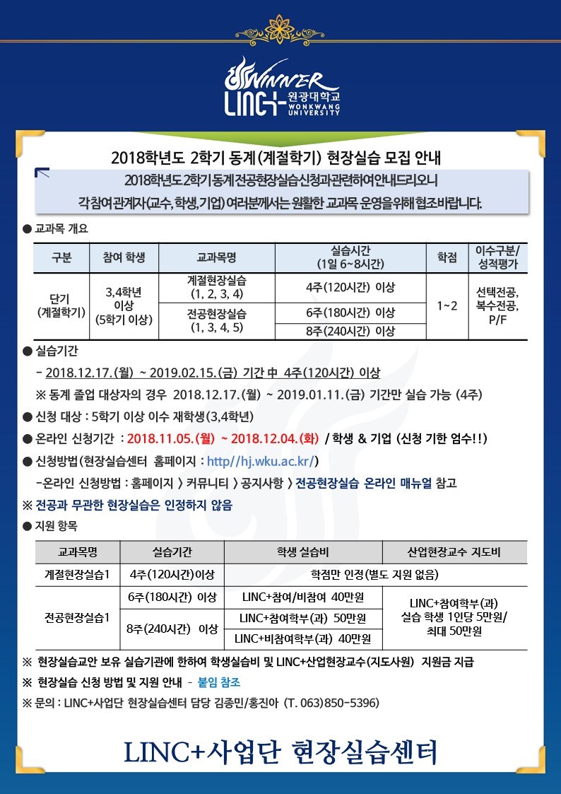 2018년 동계 전공현장실습 신청 기간입니다. (12월 4일까지)